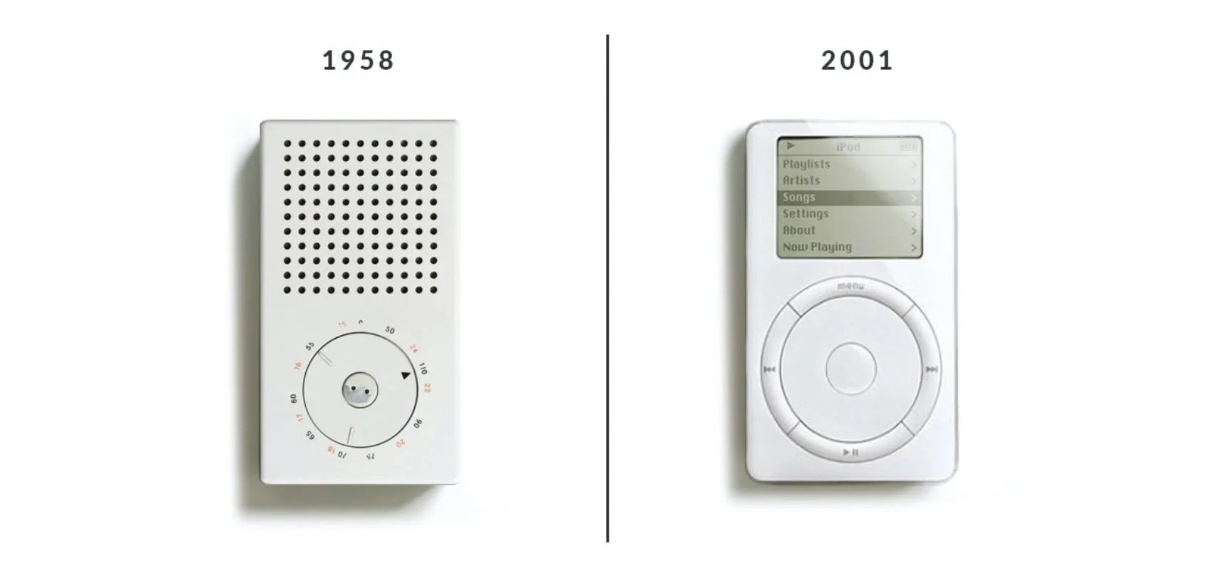 Dieter Rams’ T3 transistor radio, alongside Apple’s first iPod